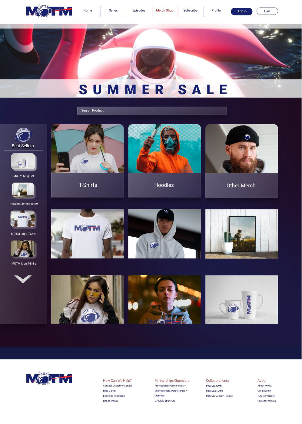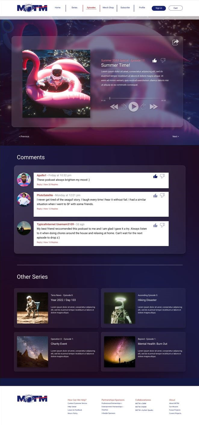 To support their growing brand, I designed a website User Interface that serves as both a hub for their podcast and an online storefront for their upcoming merch shop. The User Interface had to be simple yet full of character, reflecting M.O.T.M.’s laid-back but engaging style. I incorporated a modern aesthetic with glassmorphism, blending sleek, semi-transparent elements with bold typography to create a modern and simple-to-navigate user experience. The layout was designed for easy navigation, ensuring that M.O.T.M's audience could explore podcast episodes, comment, browse the merch shop, and navigate through the website with ease. By balancing a clean, modern look with a more carefree style, I helped M.O.T.M. emit a strong digital presence that resonates with their audience while staying true to their brand identity.